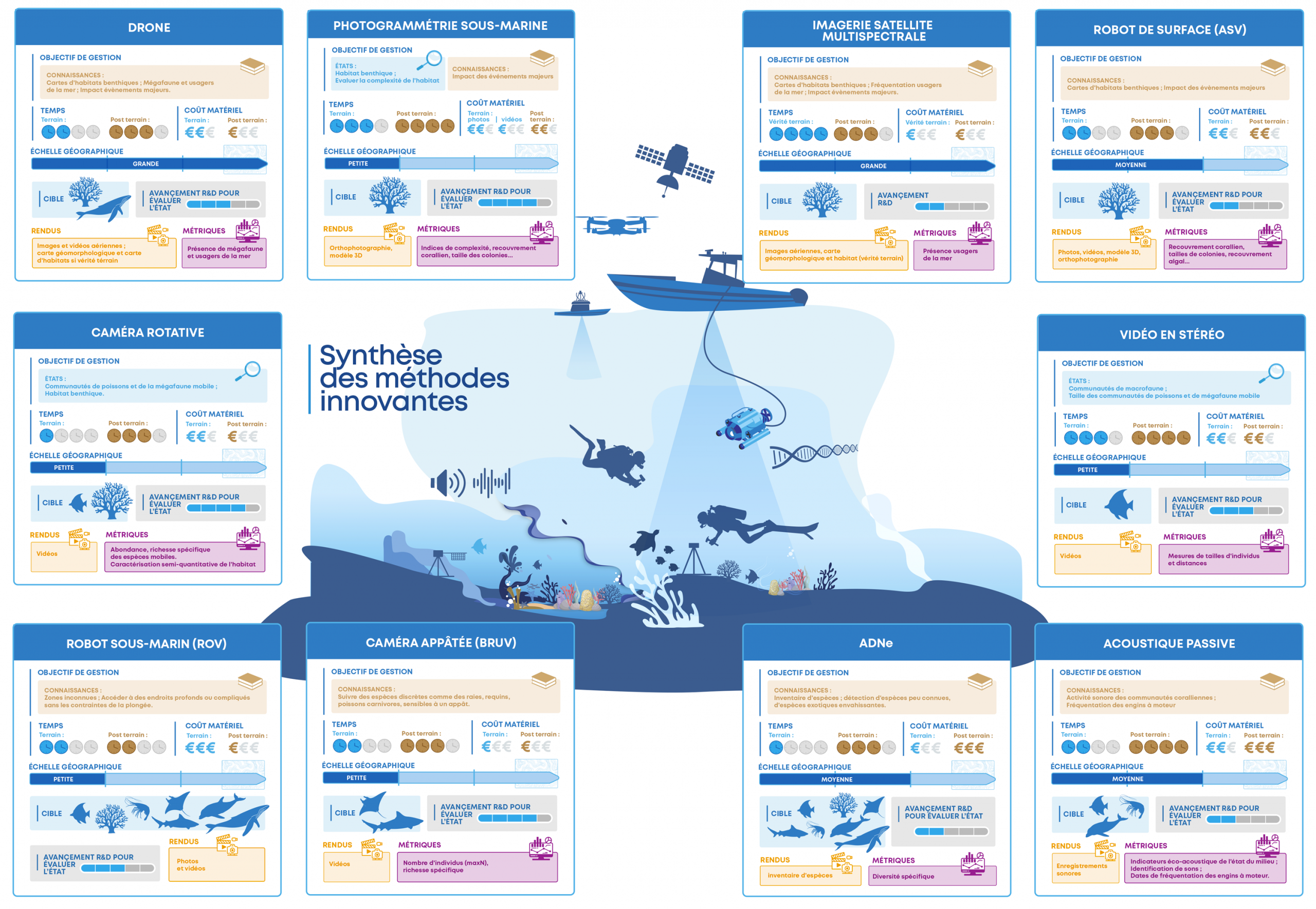L’objectif est d’informer les gestionnaires des récifs coralliens sur l’intérêt et l’avancement des méthodes innovantes de suivi de l’état des récifs coralliens, pour l’ensemble des territoires coralliens des outre-mer français. Chaque territoire ayant ses spécificités, le guide propose différentes façons d’aborder la méthode selon les moyens disponibles (financiers, humains…).