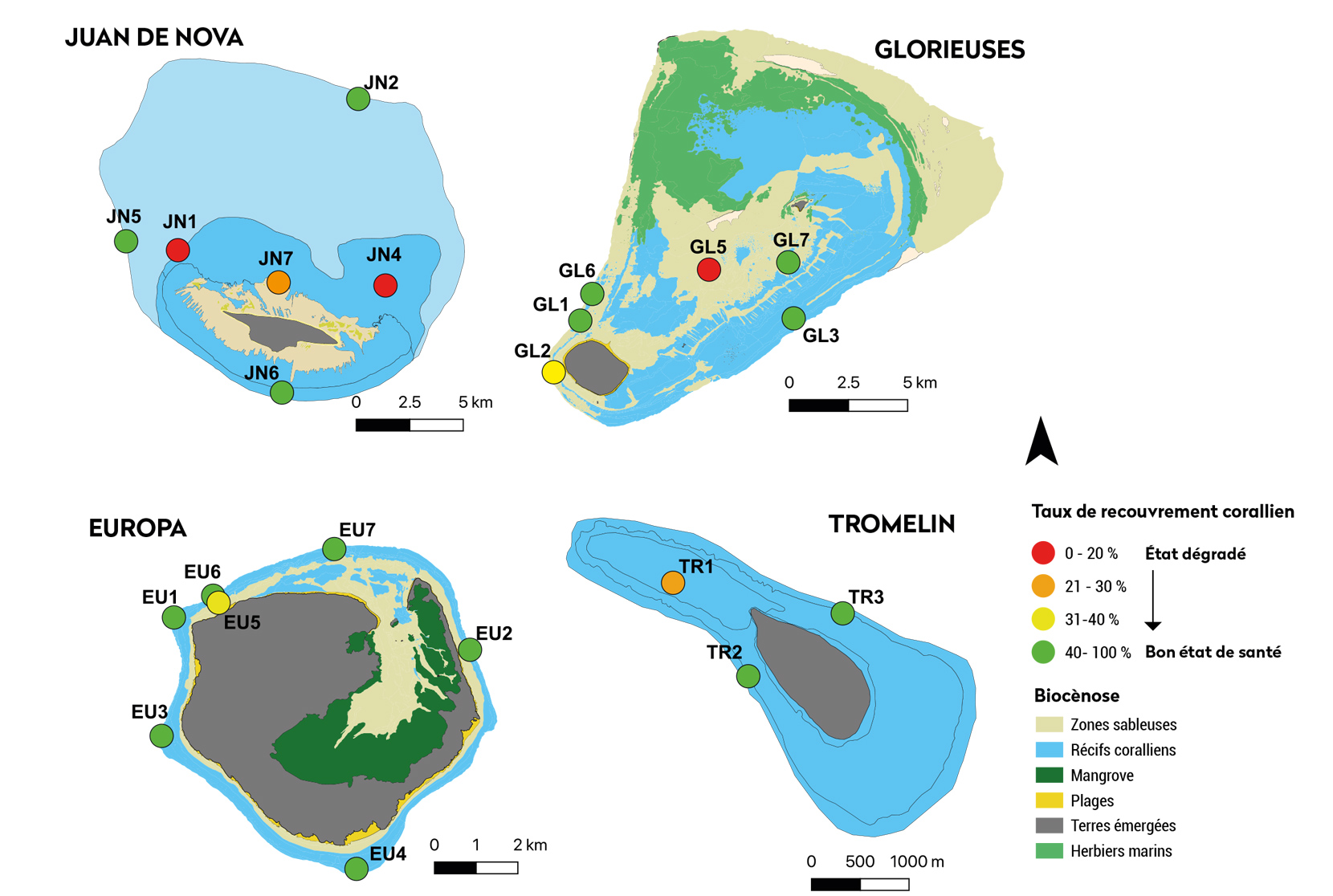 Le réseau GCRMN compte aujourd’hui 27 stations : 7 à Europa, 6 à Glorieuses et 7 à Juan de Nova, 4 à Bassas da India et 2 à Tromelin.